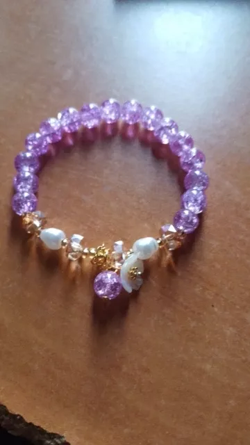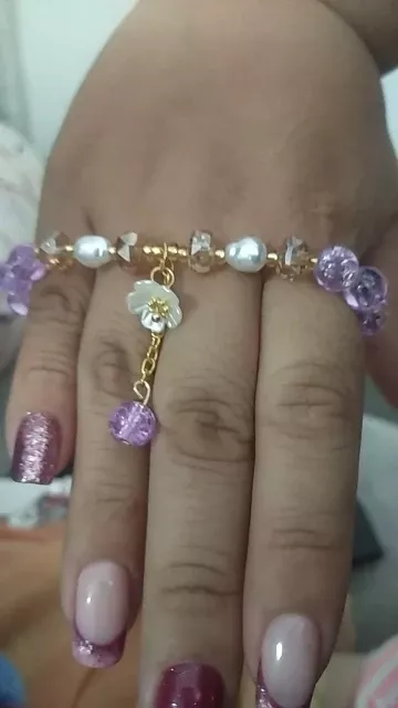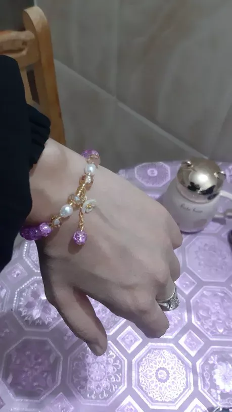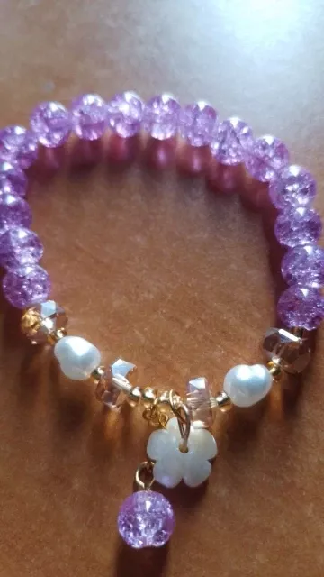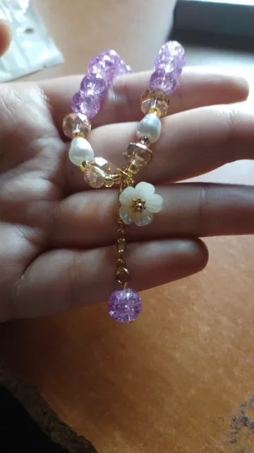 Man, this bracelet is the bomb! 💣 I got it for my girl and she can't stopin' it off. The purple beads are just so elegant and that white flower? Perfect touch man. She says it's comfortable too, doesn't scratch or anything like that.