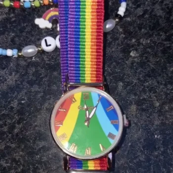 I cannot express how much I adore this watch The rainbow quartz face is an absolute spectacle to behold. It's a mesmerizing blend of colors that immediately draws your attention, making the star of any ensemble you pair it with. However, despite its eye-catching design, it manages to maintain a level of subtlety which ensures that it doesn't come off as overly ostentatious or gaudy. This timepiece is truly the perfect accessory for any outfit in my wardrobe. Whether I'm dressed up for a formal or simply running errands on a casual day out, this watch adds just the right touch of elegance and style without overpowering the rest of my look. Its versatility makes it an essential piece in my collection - one that can adapt to every fashion situation. In conclusion, I am hopelessly smitten by this beautiful rainbow wristwatch – not only because of its striking appearance but also due to its versatile nature and capability of turning heads wherever I go while still maintaining an air of understated elegance! 😍