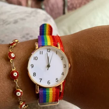 With a vibrant rainbow-colored fabric belt, this watch adds a pop of color to any outfit, making it perfect for both casual and formal occasions. The quartz movement ensures accurate timekeeping, so you’ll never miss a beat.