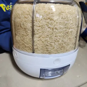 A smooth-rotating, cupboard-friendly grain dispenser, ideal for storing various items like rice, beans, and lentils.