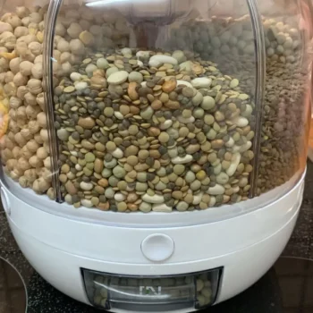 Excellent for lentils and rice but struggles with larger beans. A handle for easier rotation would enhance the experience. Still, a great addition for efficient storage.