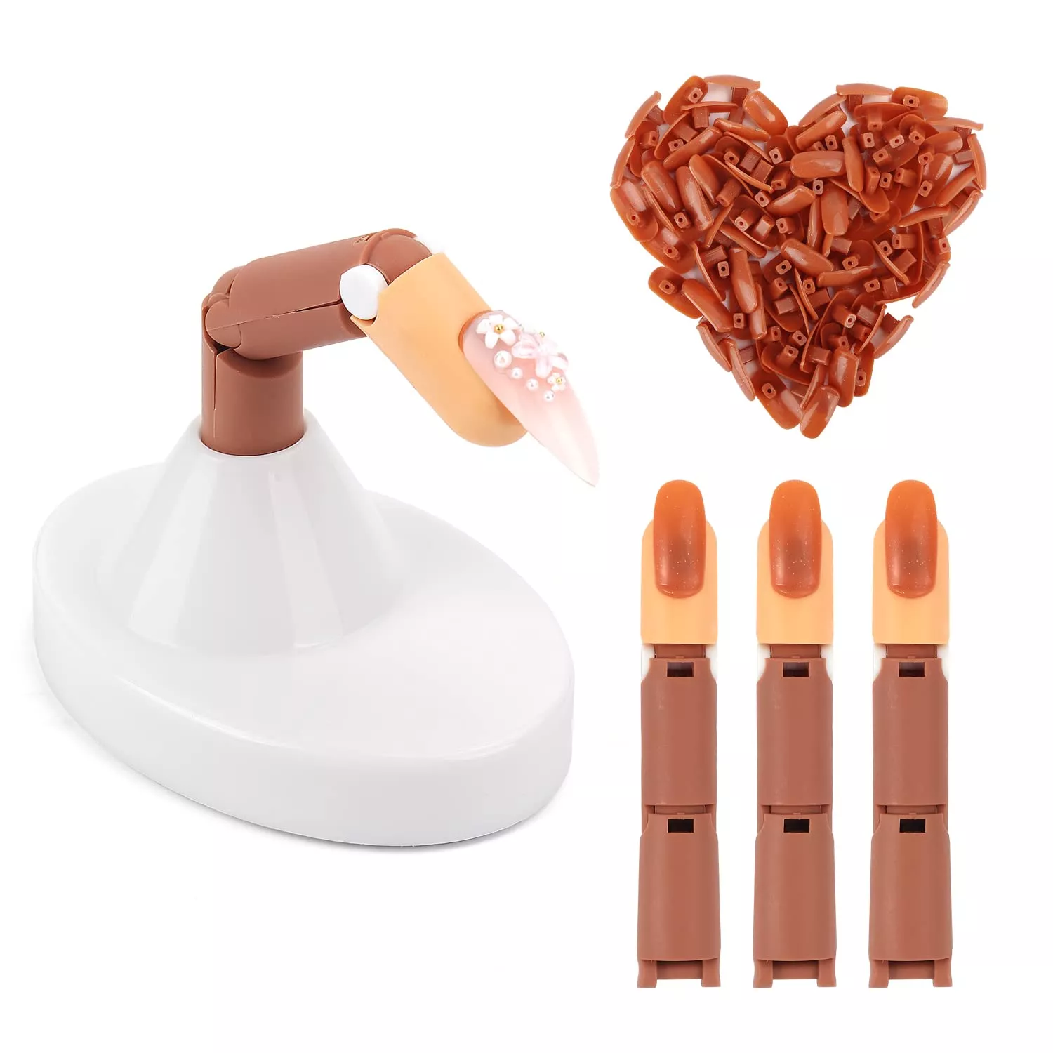 The kit comes with a total of 3 middle fingers, a sturdy finger base for easy practice, and a bag of approximately 100 replacement brown acrylic nail tips. This ensures you have plenty of practice pieces to keep honing your craft. The realistic design allows for true-to-life nail art applications, giving you the chance to develop your skills on a real-looking hand.