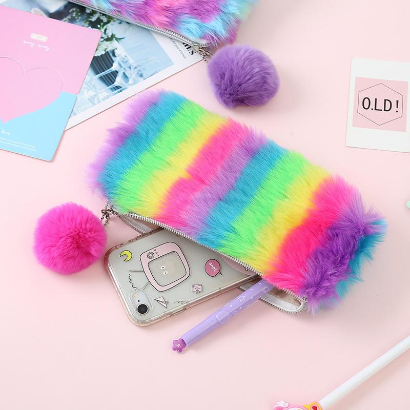 Rainbow Plush Pencil Case for Girls – Large School Pen Bag