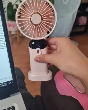 • Can be used as a handheld fan, hung around your neck, or placed on your desktop
