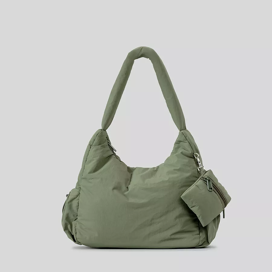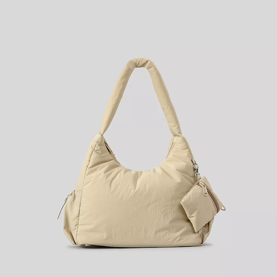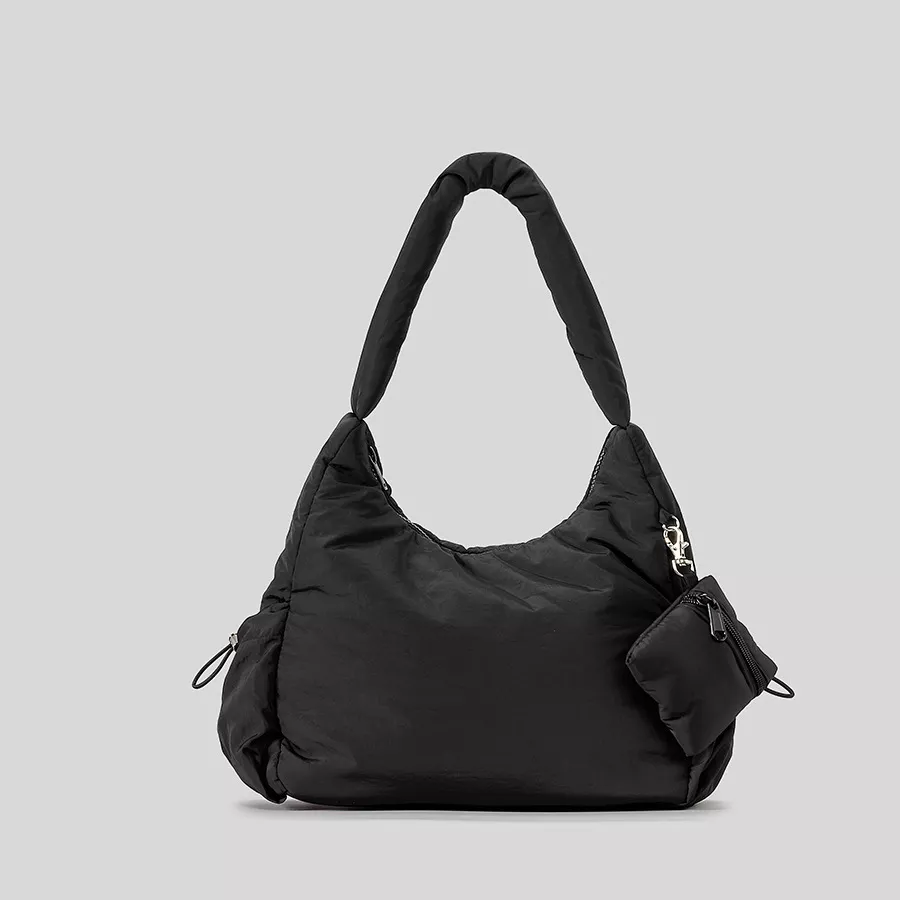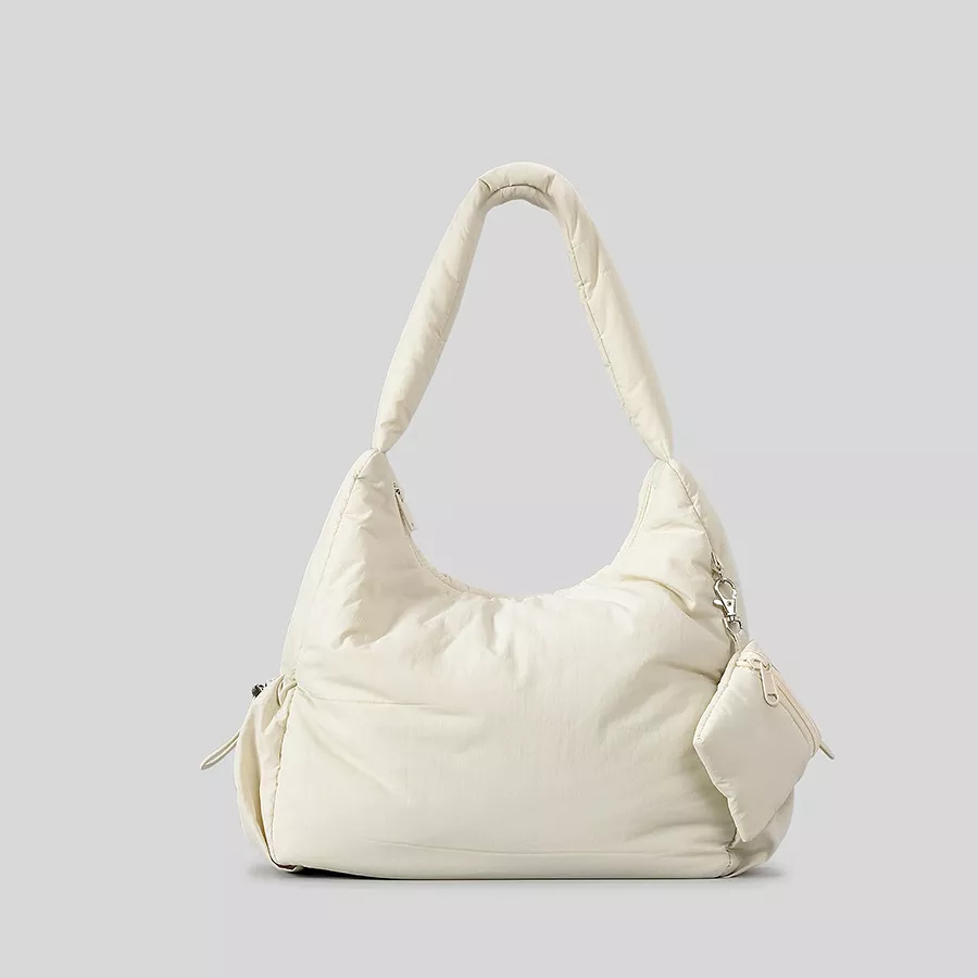 With its compact yet functional design, this puffer shoulder bag offers just the right amount of space to keep your daily essentials neat and accessible. The interior zipper pocket ensures that your valuables stay secure, while the solid color adds a touch of understated elegance to your outfit.