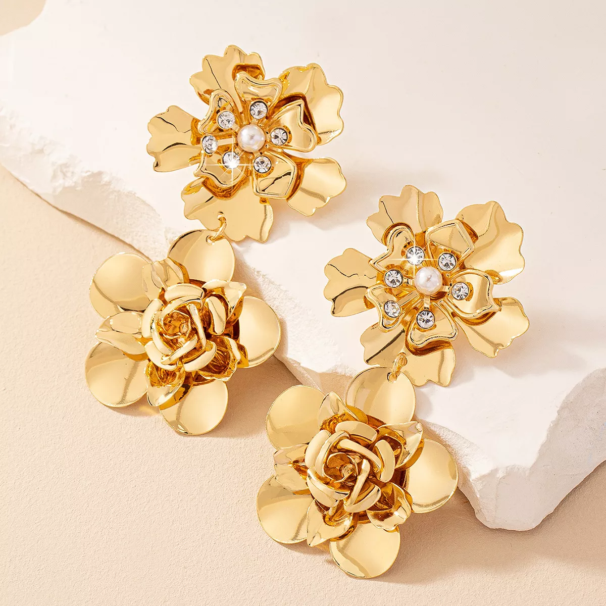 The double-layered design of the petals gives these earrings a sense of depth, making them stand out from the crowd. They catch the light with every movement, offering a stunning, sparkling effect that will turn heads wherever you go. The gold plating enhances the richness of the overall design, giving them a refined, high-end look that complements both casual and dressy ensembles.